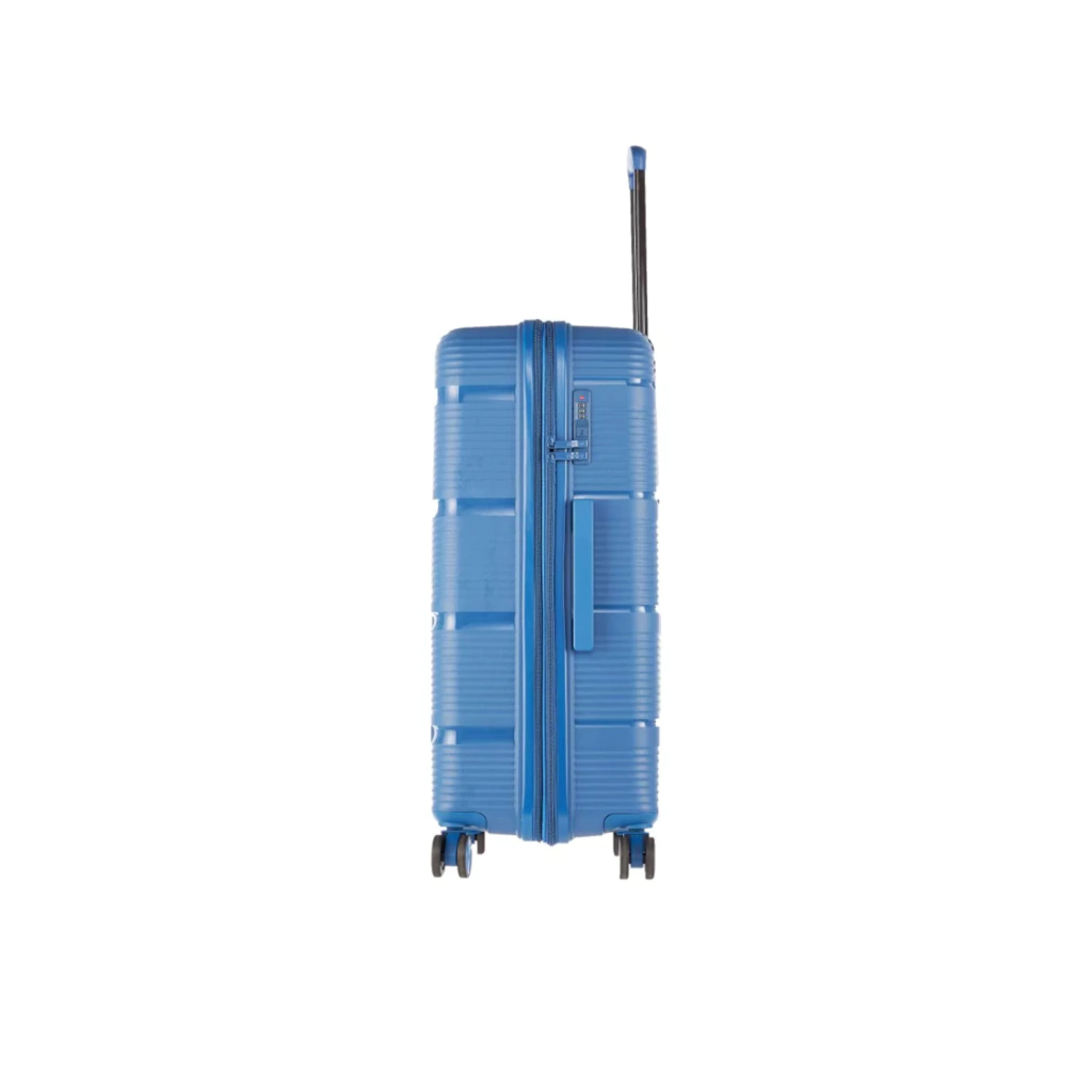 Su exterior esta compuesto por un material resistente a golpes de Polipropileno que tambien es impermeable al agua.. Posee 4 ruedas con sistema spinner con giro de 360 grados.